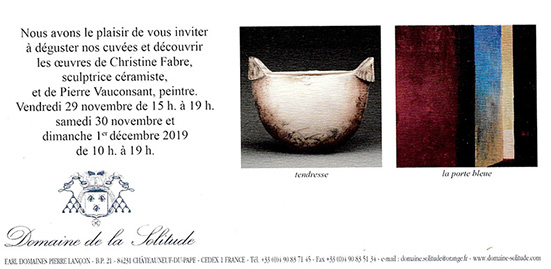 | Expositions .......................................... Antica Namur Belgique du 8 au 16 novembre 2025   Galerie Capazza Stand 19 Christine Fabre - Jani Philippe charpentier - Goudji Juliette Leperlier - Antoine Leperlier Fabrice Rebeyrolle ............................................ L'Œil Écoute Lyon 15 mars au 6 avril 2025  ......................................... 50 ans de la Galerie Capazza Nançay Thème : Équilibre 23 mars - 22 juin 2025 ......................................... Les Artistes de la Galerie Capazza  au Liuli China Museum Shanghaï  du 16 mars au 1 sept 2024 __________________________ Biennale de la Céramique Chantemerle les Grignan (26) __________________________ Sculpture au Jardin Eurre (26)  ______________ Granit et Fragile Argile Île Barbe Lyon (69) du 03 09 2022 au 02 10 2022  ______________________________ Terra Incognita Palais Jacques Coeur. Bourges Juillet - Septembre 2022  ______________________________ Galerie Capazza Co-Exister Mars Mai 2022 ______________________________ PURE  Exposition du 24 juin au 18 juillet 2021 Chapelle de l'Île Barbe 69009 Lyon ___________________________________ Exposition Collective Enfance  Galerie Capazza Nançay 20 mars au 1 juillet 2021 ____________________________________ Liuli Shanghaï Museum  Exposition Personnelle ___________________________________ TERRE ! Escales Mythiques en Méditerranée Musée d'Histoire de Marseille Les Rames de la Fontaine Saint Sulpice ___________________________________ Exposition Personnelle Galerie TERRA VIVA du 02 08 2020 au 02 09 2020 __________________________________ CHRISTINE FABRE du 29 au 31 novembre 2019 au Domaine de la Solitude 84231 Chateauneuf-du-Pape Vernissage le vendredi 29 novembre  __________________________ "PRESENCES" du 3 aout au 15 septembre 2019 Christine Fabre et Inge Horups à la Magnanerie de Seillans (83) _________________________ CHRISTINE FABRE Paris du 27 au 30 juin 2019 Les journées de la Céramique place Saint Sulpice Paris 6 _____________________________ CHRISTINE FABRE GALERIE S EMILIANI Le Parol 26220 Dieulefit _____________________________ CHRISTINE FABRE du 24 janvier au 9 mars vernissage LYON 24 JANVIER 2019 au Nouvel Institut Franco-Chinois  _________________________ exposition personnelle du 14 février au 24 mars vernissage Lyon le jeudi 14 février Galerie Licence IV 5 Place du Gouvernement Lyon 5 Vieux Lyon 06 87 95 17 98  Exposition personnelle Atelier-Galerie J.-J. Hofstetter Rue des Epouses 18 CH-1700 Fribourg du 7 sept au 6 oct 2018 _________________________________ Grève Blanche du 6 septembre au 21 Octobre 2018 Galerie Licence IV 5 place du Gouvernement 69005 Lyon  ___________________________ Présence aux Tupiniers de LYON avec les oeuvres réalisées avec Erik Barrey Duo Potier - Vannier 8 et 9 septembre 2018  ________________________________ Biennale Céramique 26230 Chantemerle les Grignan Drôme du 09 au 11 juin 2018  ________________________________ Galerie Capazza Nançay mars 2018 réouverture Exposition de groupe "Miroir des sentiments"  ________________________________ Exposition du 20 mai 2017 au 16 juin  Galerie Marianne Brand 20 rue Ancienne CH - 1227 Carouge-Genève tel 022 301 34 57 www.galeriembrand _________________________________  Exposition à la Caverne Pont d'Arc copie de la Grotte Chauvet (Ardèche) du 19 dec 2016 au 30 juin 2017 _____________________________________ EXPOSITIONS PERSONNELLES 2016 ___________________________ Suite de l'exposition de Shanghaï à Taïwan Liuligongfang Taïpei du 1 juillet au 30 octobre 2016 http://www.liuli.com.tw/index.aspx  ________________________ Du 14 Août au 6 octobre Galerie du Don (F) 12140 Le Fel ___________________ du 3 juin au 9 juillet Troyes Galerie Artes (F) 10150 Pont-Sainte-Marie _________________________ ________________________ EXPOSITIONS 2015 LIULI
